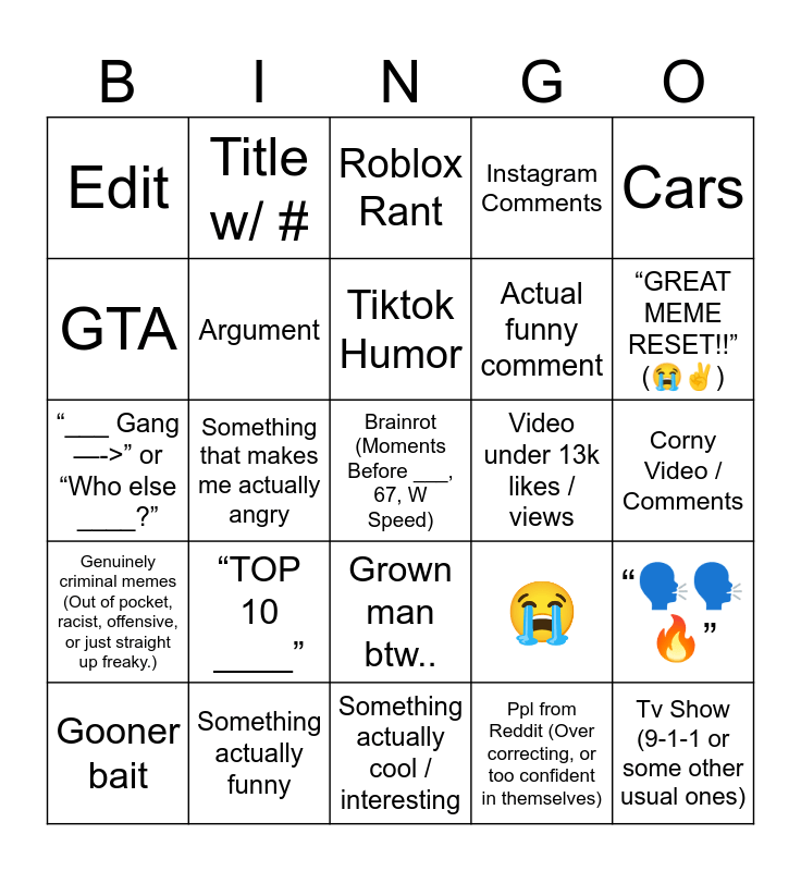 This bingo card has a free space and 24 words: “TOP 10 ____”, Something actually funny, Tiktok Humor, Gooner bait, Cars, Edit, GTA, Title w/ #, Video under 13k likes / views, Grown man btw.., Actual funny comment, “___ Gang —->” or “Who else ____?”, 😭, “🗣️🗣️🔥”, Argument, Ppl from Reddit (Over correcting, or too confident in themselves), Corny Video / Comments, Roblox Rant, “GREAT MEME RESET!!” (😭✌️), Something that makes me actually angry, Tv Show (9-1-1 or some other usual ones), Genuinely criminal memes (Out of pocket, racist, offensive, or just straight up freaky.), Instagram Comments and Something actually cool / interesting.