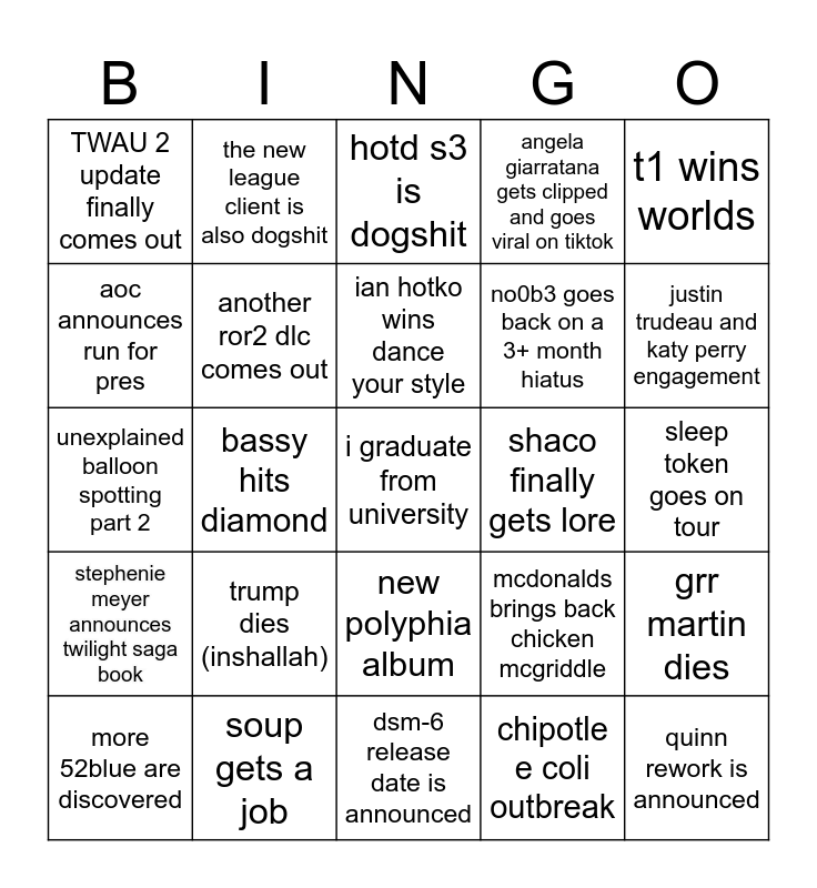 This bingo card has a free space and 24 words: trump dies (inshallah), soup gets a job, ian hotko wins dance your style, more 52blue are discovered, t1 wins worlds, TWAU 2 update finally comes out, aoc announces run for pres, the new league client is also dogshit, shaco finally gets lore, new polyphia album, no0b3 goes back on a 3+ month hiatus, unexplained balloon spotting part 2, mcdonalds brings back chicken mcgriddle, grr martin dies, another ror2 dlc comes out, chipotle e coli outbreak, sleep token goes on tour, hotd s3 is dogshit, justin trudeau and katy perry engagement, bassy hits diamond, quinn rework is announced, stephenie meyer announces twilight saga book, angela giarratana gets clipped and goes viral on tiktok and dsm-6 release date is announced.