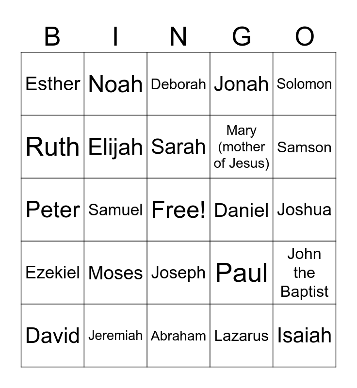 This bingo card has a free space and 25 words: Moses, Abraham, Sarah, David, Solomon, Esther, Ruth, Noah, Daniel, Joseph, Mary (mother of Jesus), Peter, Paul, John the Baptist, Elijah, Elisha, Joshua, Deborah, Samson, Samuel, Isaiah, Jeremiah, Ezekiel, Jonah and Lazarus.