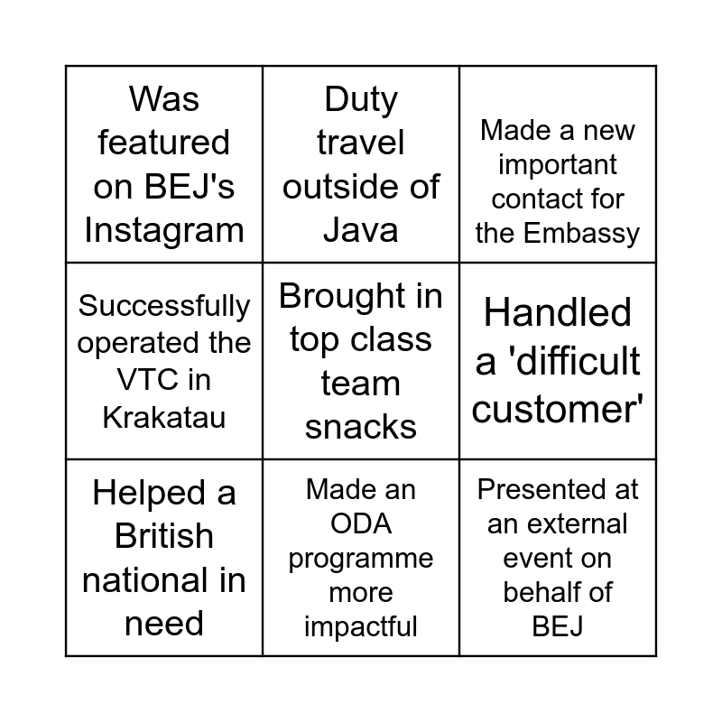 This bingo card has a free space and 19 words: Helped a UK company win a contract, Learned a new skill on co-pilot, Made a new important contact for the Embassy, Got great feedback on a political report, Supported a Ministerial or high‑level delegation, Presented at an external event on behalf of BEJ, Brought the fun to a social committee event, Was featured on BEJ's Instagram, Duty travel outside of Java, Drank a strawberry Yakult from the canteen, Handled a dump of visa requests, Handled a 'difficult customer', Helped a British national in need, Wore embassy batik 2 days in a row, Reconciled their expenses within 30 days, Played with one of the Embassy cats, Successfully operated the VTC in Krakatau, Made an ODA programme more impactful and Ran an L&D event.