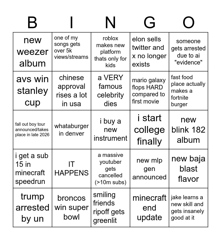 This bingo card has a free space and 24 words: IT HAPPENS, broncos win super bowl, a VERY famous celebrity dies, trump arrested by un, someone gets arrested due to ai "evidence", new weezer album, avs win stanley cup, one of my songs gets over 5k views/streams, i start college finally, a massive youtuber gets cancelled (>10m subs), mario galaxy flops HARD compared to first movie, fall out boy tour announced/takes place in late 2026, new mlp gen announced, new baja blast flavor, chinese approval rises a lot in usa, minecraft end update, new blink 182 album, roblox makes new platform thats only for kids, fast food place actually makes a fortnite burger, whataburger in denver, jake learns a new skill and gets insanely good at it, i get a sub 15 in minecraft speedrun, elon sells twitter and x no longer exists and smiling friends ripoff gets greenlit.