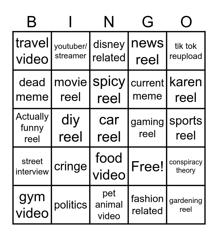 This bingo card has 25 words: cringe, pet animal video, spicy reel, gym video, tik tok reupload, travel video, dead meme, youtuber/ streamer, gaming reel, food video, current meme, Actually funny reel, Free!, conspiracy theory, movie reel, gardening reel, sports reel, disney related, karen reel, diy reel, car reel, politics, street interview, news reel and fashion related.