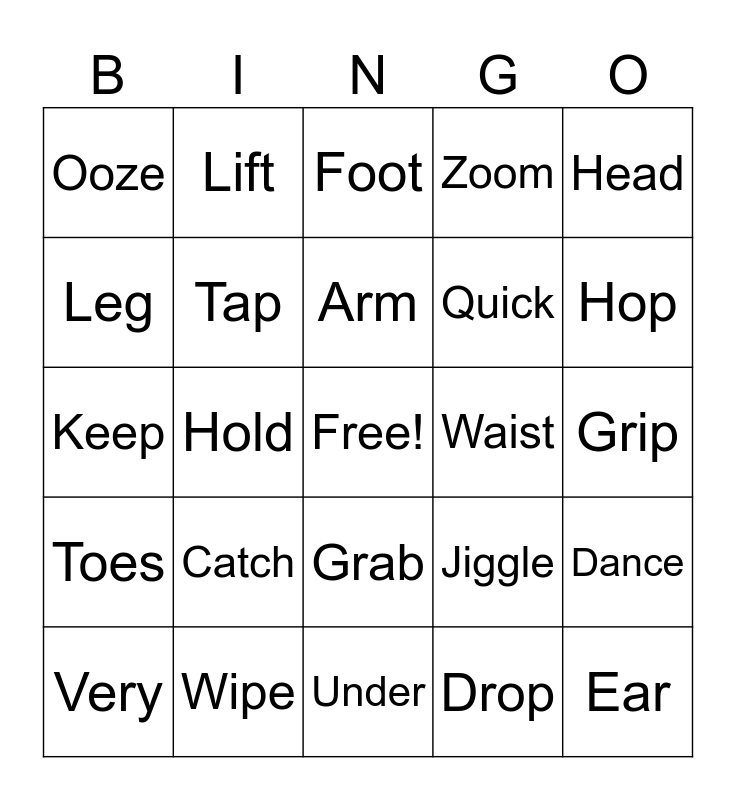 This bingo card has a free space and 42 words: Alphabet, Arm, Back, Catch, Drop, Dance, Ear, Fall, Foot, Grab, Grip, Hop, Hold, Head, Ice, Jiggle, Jump, Keep, Knee, Lift, Leg, March, Neck, Ooze, Off, Pat, Quick, Quiver, Run, Slide, Side, Toes, Tap, Under, Vibrate, Very, Wipe, Waist, X-ray, You, Zoom and Rag.
