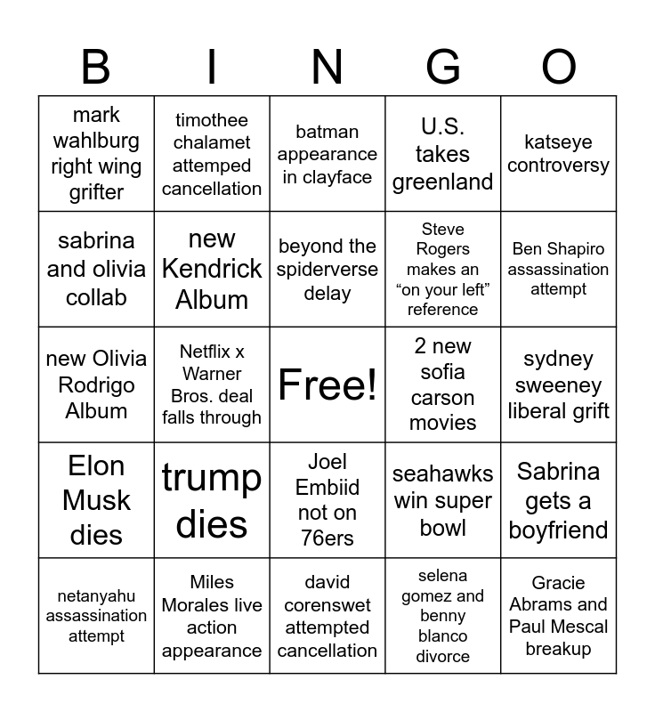 This bingo card has a free space and 24 words: netanyahu assassination attempt, trump dies, beyond the spiderverse delay, selena gomez and benny blanco divorce, katseye controversy, mark wahlburg right wing grifter, timothee chalamet attemped cancellation, batman appearance in clayface, 2 new sofia carson movies, sydney sweeney liberal grift, new Olivia Rodrigo Album, new Kendrick Album, seahawks win super bowl, Sabrina gets a boyfriend, sabrina and olivia collab, Miles Morales live action appearance, david corenswet attempted cancellation, U.S. takes greenland, Ben Shapiro assassination attempt, Elon Musk dies, Netflix x Warner Bros. deal falls through, Joel Embiid not on 76ers, Steve Rogers makes an “on your left” reference and Gracie Abrams and Paul Mescal breakup.