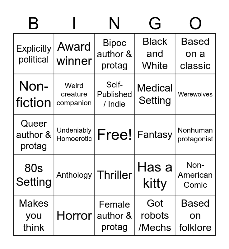 This bingo card has a free space and 24 words: Anthology, Horror, Self-Published / Indie, Makes you think, Based on a classic, Explicitly political, Non-fiction, Award winner, Fantasy, Thriller, Medical Setting, Queer author & protag, Has a kitty, Non-American Comic, Weird creature companion, Got robots /Mechs, Nonhuman protagonist, Bipoc author & protag, Werewolves, Undeniably Homoerotic, Based on folklore, 80s Setting, Black and White and Female author & protag.