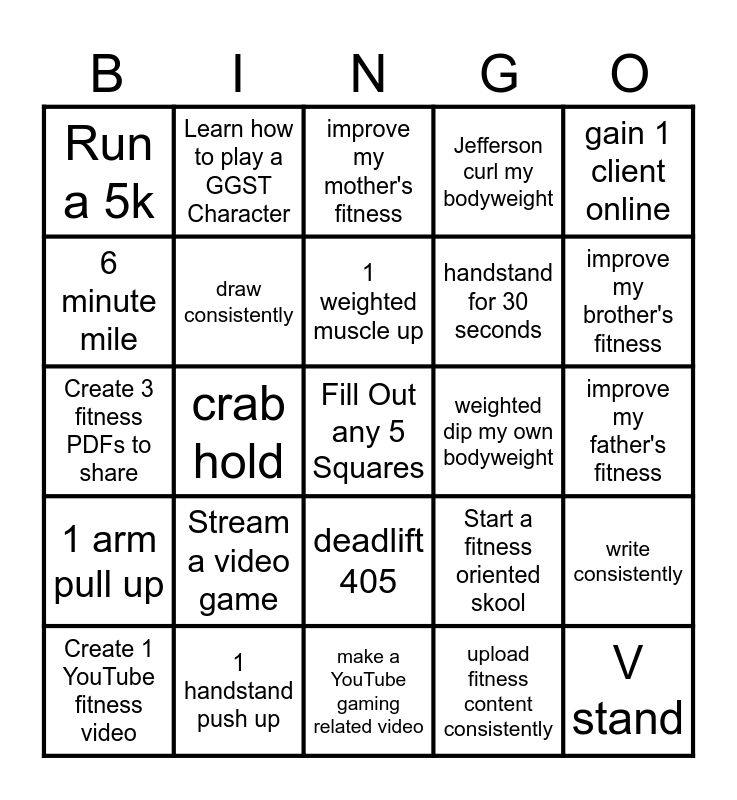 This bingo card has a free space and 24 words: Stream a video game, 1 handstand push up, 1 weighted muscle up, Create 1 YouTube fitness video, gain 1 client online, Run a 5k, 6 minute mile, Learn how to play a GGST Character, weighted dip my own bodyweight, deadlift 405, handstand for 30 seconds, Create 3 fitness PDFs to share, Start a fitness oriented skool, write consistently, draw consistently, upload fitness content consistently, improve my father's fitness, improve my mother's fitness, improve my brother's fitness, crab hold, V stand, 1 arm pull up, Jefferson curl my bodyweight and make a YouTube gaming related video.