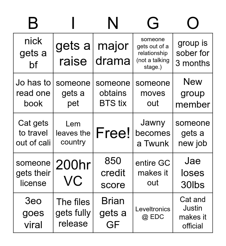 This bingo card has a free space and 24 words: 3eo goes viral, 200hr VC, someone obtains BTS tix, Leveltronics @ EDC, group is sober for 3 months, nick gets a bf, gets a raise, major drama, Jawny becomes a Twunk, someone gets a new job, Cat gets to travel out of cali, someone gets a pet, entire GC makes it out, Jae loses 30lbs, Jo has to read one book, The files gets fully release, Brian gets a GF, someone gets out of a relationship (not a talking stage.), New group member, someone gets their license, Lem leaves the country, 850 credit score, someone moves out and Cat and Justin makes it official.