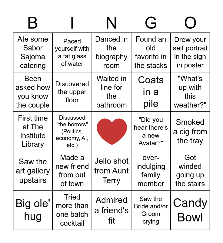 This bingo card has a free space and 26 words: Jello shot from Aunt Terry, Saw the Bride and/or Groom crying, Waited in line for the bathroom, Tried more than one batch cocktail, Drew your self portrait in the sign in poster, Ate some Sabor Sajoma catering, Been asked how you know the couple, Paced yourself with a fat glass of water, Smoked a cig from the tray, over-indulging family member, Coats in a pile, First time at The Institute Library, Got winded going up the stairs, Big ole' hug, Discussed "the horrors" (Politics, economy, AI, etc.), Said howdy to Wayne, Found an old favorite in the stacks, Saw the art gallery upstairs, Danced in the biography room, Candy Bowl, "What's up with this weather?", Admired a friend's fit, "Did you hear there's a new Avatar?", Made a new friend from out of town, Discovered the upper floor and Made a new friend.