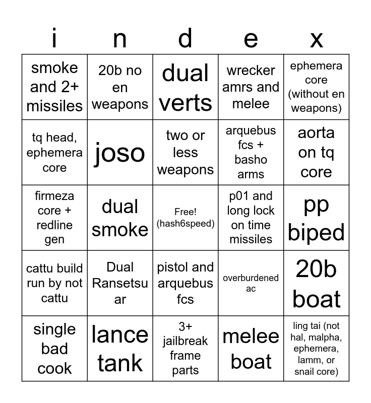 This bingo card has a free space and 24 words: Dual Ransetsu ar, lance tank, two or less weapons, single bad cook, ephemera core (without en weapons), smoke and 2+ missiles, tq head, ephemera core, 20b no en weapons, p01 and long lock on time missiles, pistol and arquebus fcs, arquebus fcs + basho arms, firmeza core + redline gen, overburdened ac, 20b boat, joso, melee boat, pp biped, dual verts, aorta on tq core, dual smoke, ling tai (not hal, malpha, ephemera, lamm, or snail core), cattu build run by not cattu, wrecker amrs and melee and 3+ jailbreak frame parts.