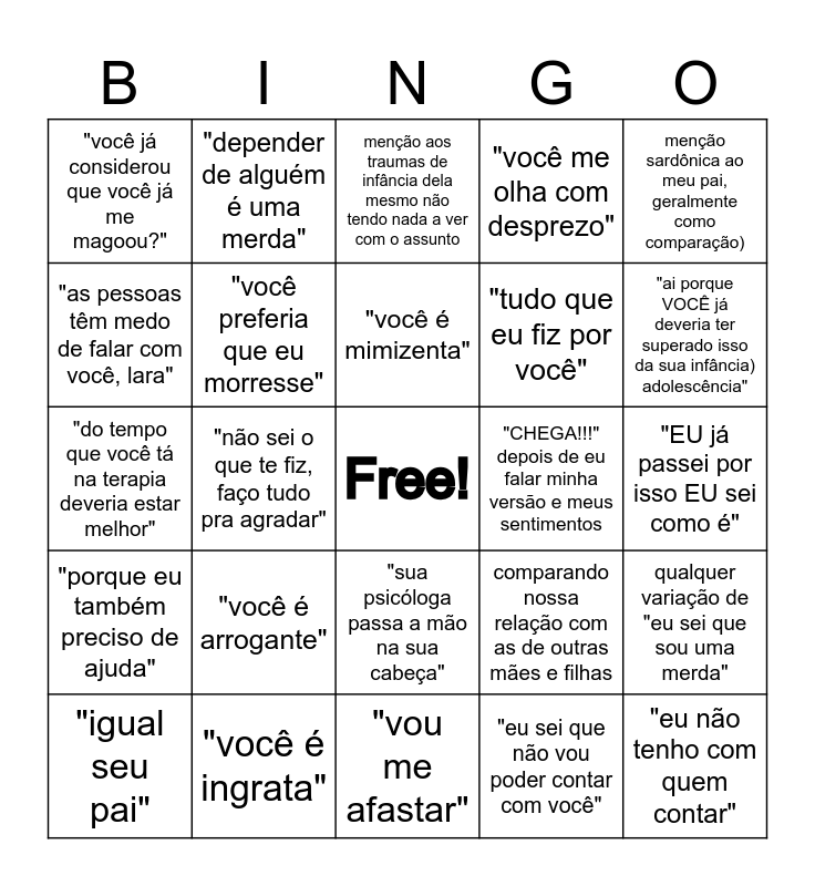 This bingo card has a free space and 24 words: "você é arrogante", "você é ingrata", "você é mimizenta", "igual seu pai", menção sardônica ao meu pai, geralmente como comparação), "você já considerou que você já me magoou?", "as pessoas têm medo de falar com você, lara", "depender de alguém é uma merda", "CHEGA!!!" depois de eu falar minha versão e meus sentimentos, "sua psicóloga passa a mão na sua cabeça", "tudo que eu fiz por você", "do tempo que você tá na terapia deveria estar melhor", comparando nossa relação com as de outras mães e filhas, qualquer variação de "eu sei que sou uma merda", "você preferia que eu morresse", "eu sei que não vou poder contar com você", "EU já passei por isso EU sei como é", menção aos traumas de infância dela mesmo não tendo nada a ver com o assunto, "ai porque VOCÊ já deveria ter superado isso da sua infância) adolescência", "não sei o que te fiz, faço tudo pra agradar", "eu não tenho com quem contar", "porque eu também preciso de ajuda", "você me olha com desprezo" and "vou me afastar".