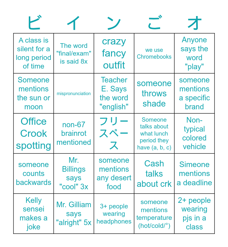 This bingo card has a free space and 24 words: Mr. Billings says "cool" 3x, Mr. Gilliam says "alright" 5x, Teacher E. Says the word "english", Kelly sensei makes a joke, Anyone says the word "play", A class is silent for a long period of time, Someone mentions the sun or moon, The word "final/exam" is said 8x, Someone talks about what lunch period they have (a, b, c), someone mentions any desert food, someone throws shade, Office Crook spotting, Cash talks about crk, Simeone mentions a deadline, mispronunciation, someone mentions temperature (hot/cold/°), Non-typical colored vehicle, crazy fancy outfit, someone mentions a specific brand, non-67 brainrot mentioned, 2+ people wearing pjs in a class, someone counts backwards, we use Chromebooks and 3+ people wearing headphones.