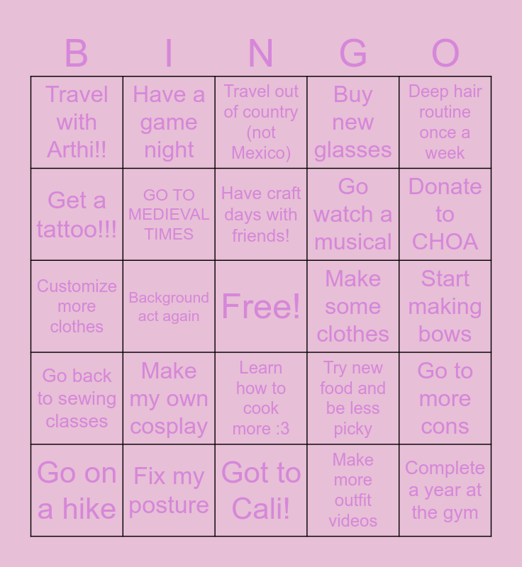 This bingo card has a free space and 24 words: Make my own cosplay, Fix my posture, Have craft days with friends!, Go on a hike, Deep hair routine once a week, Travel with Arthi!!, Get a tattoo!!!, Have a game night, Make some clothes, Learn how to cook more :3, Go watch a musical, Customize more clothes, Try new food and be less picky, Go to more cons, GO TO MEDIEVAL TIMES, Make more outfit videos, Start making bows, Travel out of country (not Mexico), Donate to CHOA, Background act again, Complete a year at the gym, Go back to sewing classes, Buy new glasses and Got to Cali!.