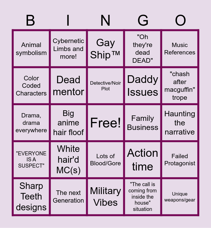 This bingo card has a free space and 24 words: White hair'd MC(s), The next Generation, Detective/Noir Plot, Sharp Teeth designs, Music References, Animal symbolism, Color Coded Characters, Cybernetic Limbs and more!, Family Business, Lots of Blood/Gore, Daddy Issues, Drama, drama everywhere, Action time, Failed Protagonist, Dead mentor, "The call is coming from inside the house" situation, Haunting the narrative, Gay Ship™, "chash after macguffin" trope, Big anime hair floof, Unique weapons/gear, "EVERYONE IS A SUSPECT", "Oh they're dead DEAD" and Military Vibes.