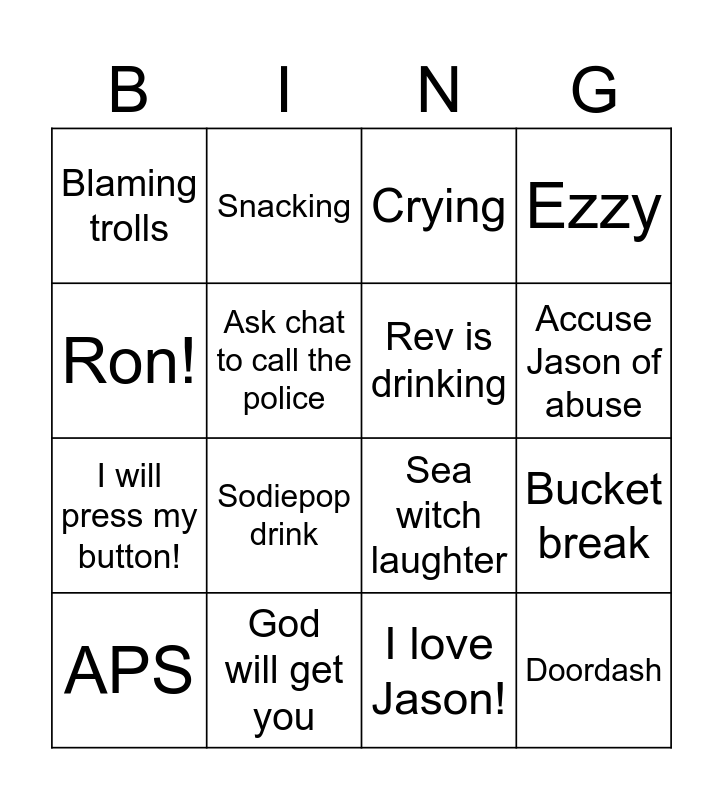This bingo card has 16 words: God will get you, Bucket break, Crying, Blaming trolls, I will press my button!, Snacking, Sea witch laughter, I love Jason!, Ron!, Ask chat to call the police, APS, Ezzy, Sodiepop drink, Accuse Jason of abuse, Rev is drinking and Doordash.