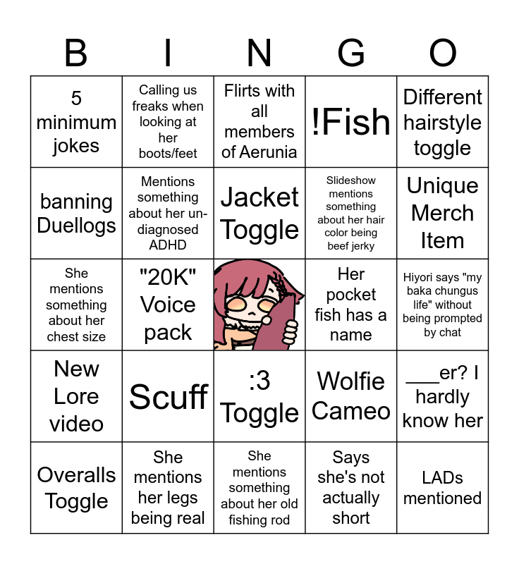 This bingo card has a free space and 24 words: Scuff, She mentions her legs being real, Jacket Toggle, Overalls Toggle, Different hairstyle toggle, 5 minimum jokes, banning Duellogs, Calling us freaks when looking at her boots/feet, Her pocket fish has a name, :3 Toggle, Slideshow mentions something about her hair color being beef jerky, She mentions something about her chest size, Wolfie Cameo, ___er? I hardly know her, Mentions something about her un-diagnosed ADHD, Says she's not actually short, Hiyori says "my baka chungus life" without being prompted by chat, Flirts with all members of Aerunia, Unique Merch Item, "20K" Voice pack, LADs mentioned, New Lore video, !Fish and She mentions something about her old fishing rod.