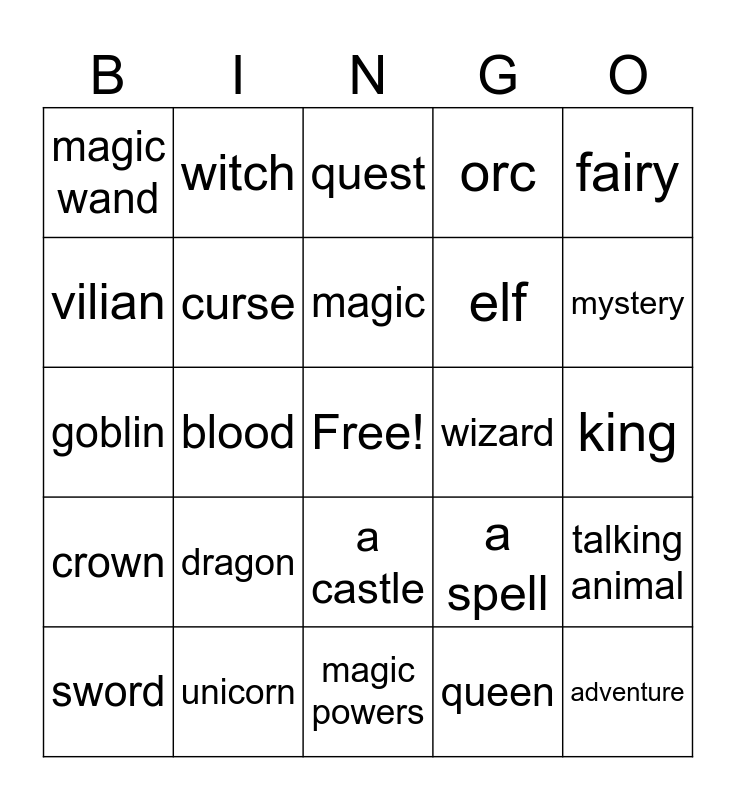 This bingo card has a free space and 24 words: dragon, unicorn, magic, sword, fairy, magic wand, vilian, witch, wizard, a castle, elf, goblin, a spell, talking animal, curse, queen, king, quest, mystery, blood, adventure, crown, orc and magic powers.