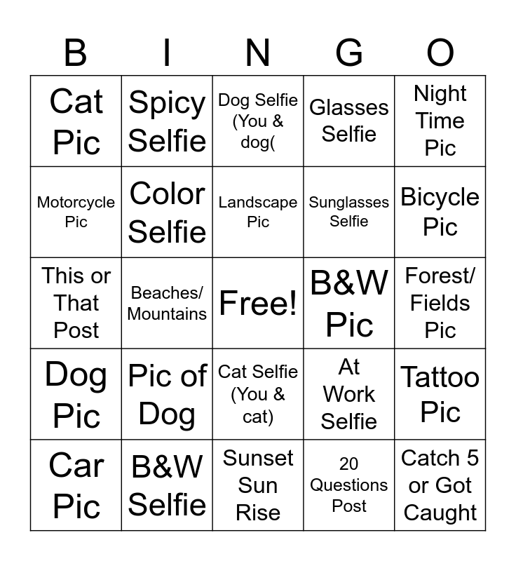 This bingo card has a free space and 24 words: Pic of Dog, B&W Selfie, Landscape Pic, Car Pic, Night Time Pic, Cat Pic, Motorcycle Pic, Spicy Selfie, B&W Pic, Cat Selfie (You & cat), Sunglasses Selfie, This or That Post, At Work Selfie, Tattoo Pic, Color Selfie, 20 Questions Post, Forest/ Fields Pic, Dog Selfie (You & dog(, Bicycle Pic, Beaches/ Mountains, Catch 5 or Got Caught, Dog Pic, Glasses Selfie and Sunset Sun Rise.