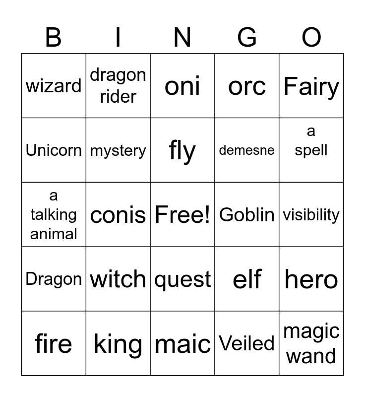 This bingo card has a free space and 24 words: witch, king, fly, fire, Fairy, wizard, Unicorn, dragon rider, Goblin, quest, demesne, a talking animal, elf, hero, mystery, Veiled, visibility, oni, a spell, conis, magic wand, Dragon, orc and maic.
