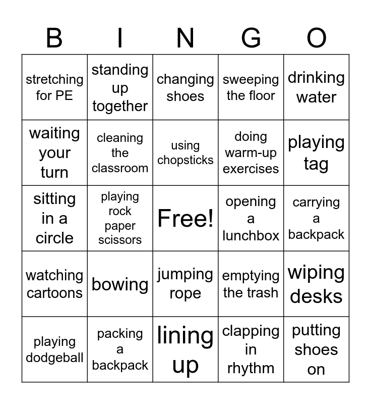 This bingo card has a free space and 46 words: taking off shoes, putting shoes on, putting shoes away, lining up, bowing, sitting on the floor, standing up together, raising a hand, waiting your turn, walking quietly, cleaning the classroom, sweeping the floor, wiping desks, emptying the trash, sorting recycling, eating rice, using chopsticks, opening a lunchbox, sharing snacks, drinking water, playing rock paper scissors, clapping in rhythm, stretching for PE, doing warm-up exercises, running laps, playing tag, playing dodgeball, playing soccer, jumping rope, watching cartoons, reading aloud, writing Hangul, erasing the board, doing homework, checking the time, packing a backpack, carrying a backpack, going to the restroom, washing hands, brushing teeth, changing into gym clothes, changing shoes, sitting in a circle, singing together, listening to the teacher and going home.