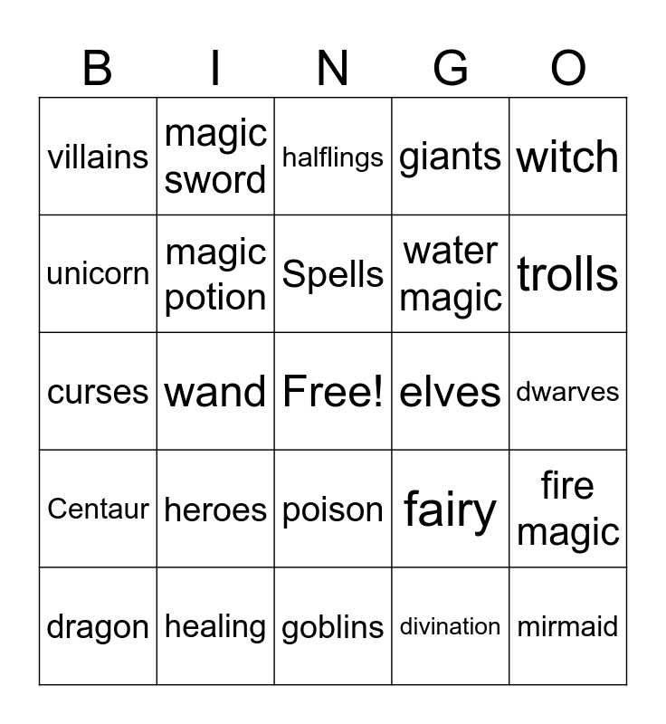 This bingo card has a free space and 24 words: dragon, heroes, Spells, divination, witch, villains, magic sword, halflings, elves, dwarves, curses, magic potion, fairy, fire magic, unicorn, healing, goblins, giants, trolls, Centaur, wand, poison, water magic and mirmaid.
