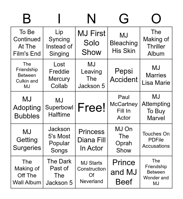 This bingo card has a free space and 24 words: Jackson 5's Most Popular Songs, The Dark Past of The Jackson 5, MJ Leaving The Jackson 5, The Making of Off The Wall Album, The Making of Thriller Album, To Be Continued At The Film's End, The Friendship Between Culkin and MJ, Lip Syncing Instead of Singing, Paul McCartney Fill In Actor, Princess Diana Fill In Actor, Pepsi Accident, MJ Adopting Bubbles, MJ On The Oprah Show, Touches On PDFile Accusations, Lost Freddie Mercury Collab, Prince and MJ Beef, MJ Attempting To Buy Marvel, MJ First Solo Show, MJ Marries Lisa Marie, MJ Superbowl Halftime, The Friendship Between Wonder and MJ, MJ Getting Surgeries, MJ Bleaching His Skin and MJ Starts Construction Of Neverland.