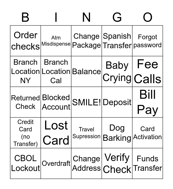 This bingo card has a free space and 24 words: Lost Card, Overdraft, Balance, CBOL Lockout, Forgot password, Order checks, Branch Location NY, Atm Misdispense, Deposit, Travel Supression, Baby Crying, Returned Check, Dog Barking, Card Activation, Branch Location Cal, Verify Check, Bill Pay, Change Package, Fee Calls, Blocked Account, Funds Transfer, Credit Card (no Transfer), Spanish Transfer and Change Address.