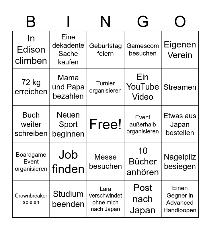This bingo card has a free space and 24 words: Job finden, Studium beenden, Turnier organisieren, Crownbreaker spielen, Eigenen Verein, In Edison climben, 72 kg erreichen, Eine dekadente Sache kaufen, Event außerhalb organisieren, Messe besuchen, Ein YouTube Video, Buch weiter schreiben, 10 Bücher anhören, Nagelpilz besiegen, Mama und Papa bezahlen, Post nach Japan, Etwas aus Japan bestellen, Geburtstag feiern, Streamen, Neuen Sport beginnen, Einen Gegner in Advanced Handloopen, Boardgame Event organisieren, Gamescom besuchen and Lara verschwindet ohne mich nach Japan.