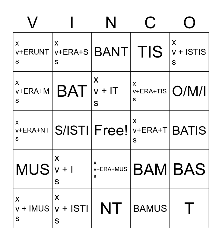 This bingo card has a free space and 24 words: x v + I s, x v + ISTI s, x v + IT s, x v + IMUS s, x v + ISTIS s, x v+ERUNT s, x v+ERA+M s, x v+ERA+S s, x v+ERA+T s, x v+ERA+MUS s, x v+ERA+TIS s, x v+ERA+NT s, BAM, BAS, BAT, BAMUS, BATIS, BANT, O/M/I, S/ISTI, T, MUS, TIS and NT.