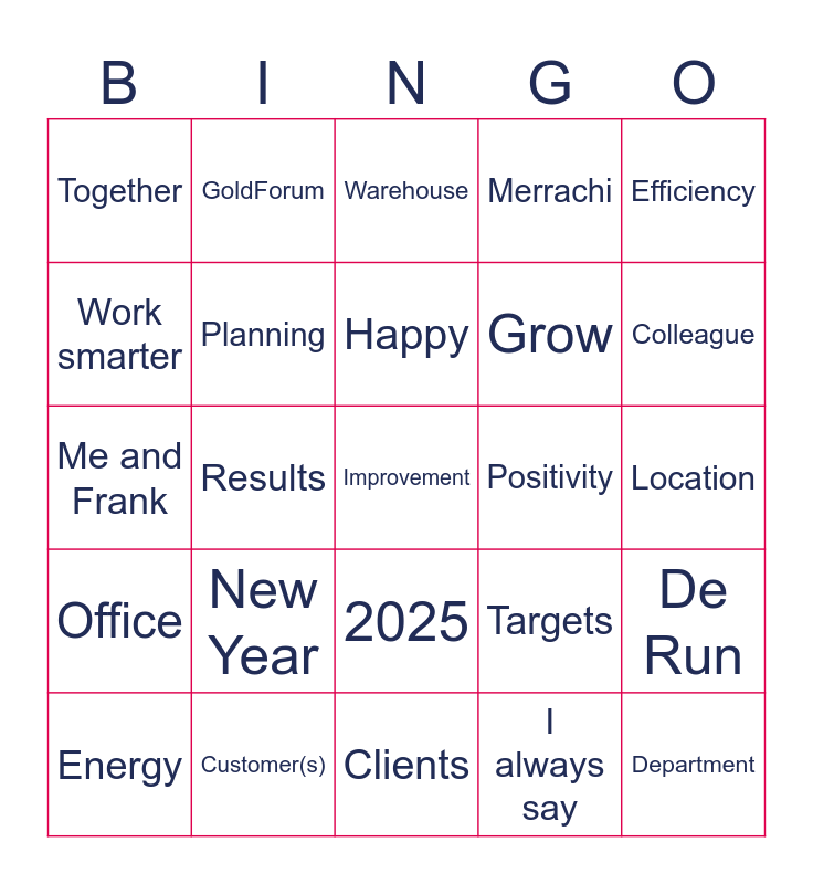 This bingo card has 25 words: New Year, Clients, Happy, Energy, Efficiency, Together, Work smarter, GoldForum, Positivity, 2025, Grow, Me and Frank, Targets, De Run, Planning, Department, Location, Warehouse, Colleague, Results, Improvement, Customer(s), Office, Merrachi and I always say.