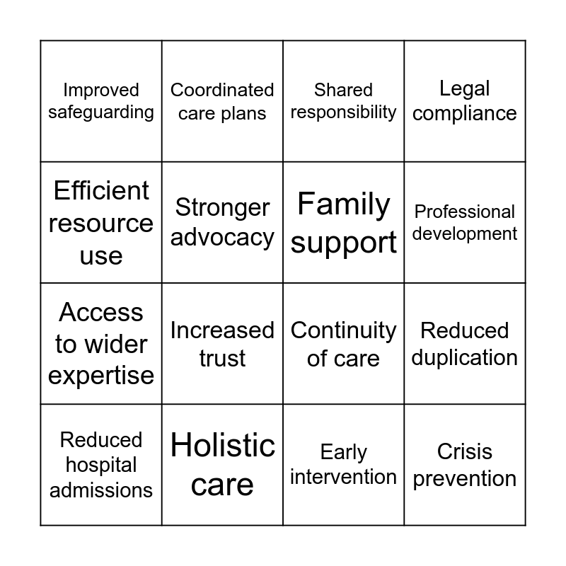 This bingo card has 16 words: Holistic care, Reduced duplication, Shared responsibility, Improved safeguarding, Access to wider expertise, Coordinated care plans, Continuity of care, Early intervention, Efficient resource use, Stronger advocacy, Reduced hospital admissions, Legal compliance, Increased trust, Professional development, Family support and Crisis prevention.