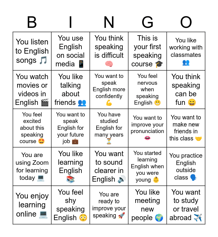 This bingo card has a free space and 24 words: You like learning English π, You feel shy speaking English π³, You want to speak English more confidently πͺ, You enjoy learning online π», You like working with classmates π₯, You listen to English songs π΅, You watch movies or videos in English π¬, You use English on social media π±, You want to improve your pronunciation π, You want to sound clearer in English π, You feel nervous when speaking English π¬, You feel excited about this speaking course π€©, You started learning English when you were young πΆ, You practice English outside class π£οΈ, You like talking about friends π₯, You like meeting new people π, You want to make new friends in this class π€, You think speaking is difficult π§ , You think speaking can be fun π, You want to speak English for your future job πΌ, You want to study or travel abroad βοΈ, You are using Zoom for learning today π», This is your first speaking course π and You are ready to improve your speaking π.