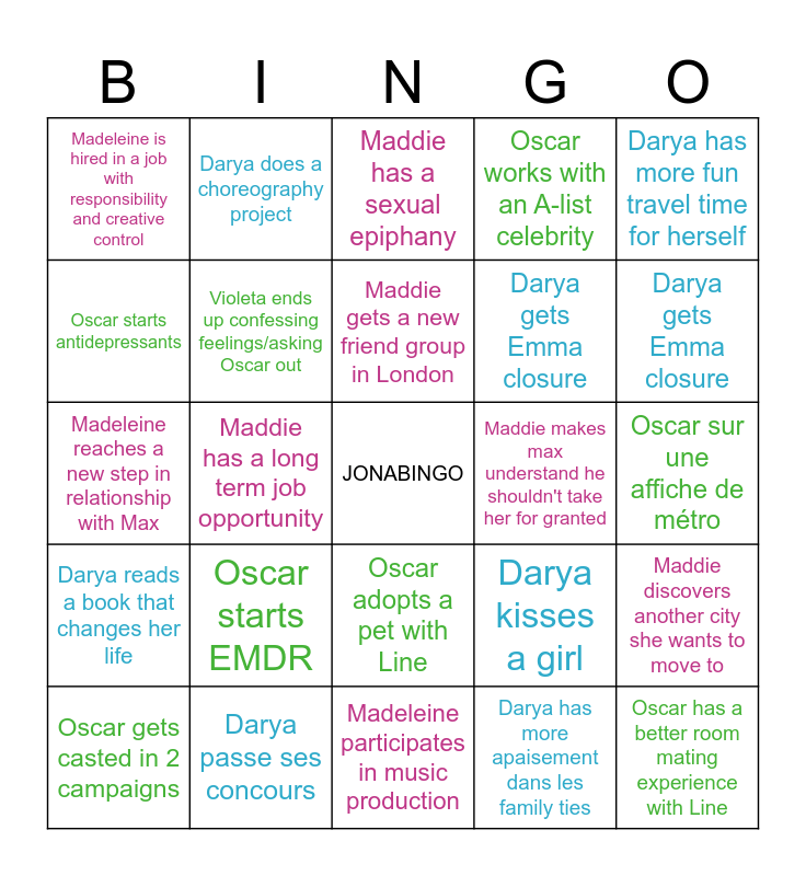 This bingo card has a free space and 24 words: Oscar starts EMDR, Darya passe ses concours, Maddie gets a new friend group in London, Oscar gets casted in 2 campaigns, Darya has more fun travel time for herself, Madeleine is hired in a job with responsibility and creative control, Oscar starts antidepressants, Darya does a choreography project, Maddie makes max understand he shouldn't take her for granted, Oscar adopts a pet with Line, Darya gets Emma closure, Madeleine reaches a new step in relationship with Max, Darya kisses a girl, Maddie discovers another city she wants to move to, Violeta ends up confessing feelings/asking Oscar out, Darya has more apaisement dans les family ties, Oscar sur une affiche de métro, Maddie has a sexual epiphany, Darya gets Emma closure, Maddie has a long term job opportunity, Oscar has a better room mating experience with Line, Darya reads a book that changes her life, Oscar works with an A-list celebrity and Madeleine participates in music production.