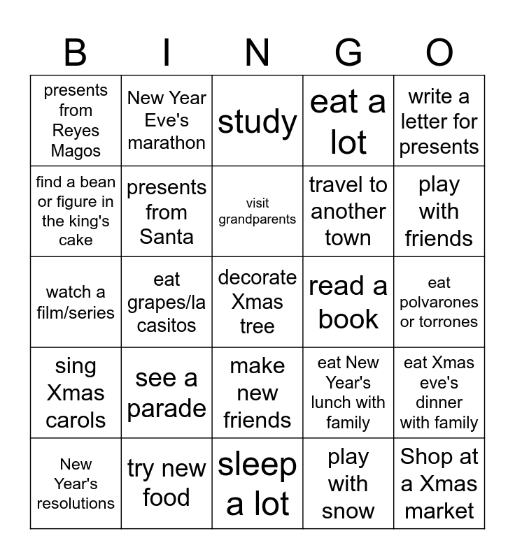 This bingo card has a free space and 24 words: see a parade, try new food, visit grandparents, New Year's resolutions, write a letter for presents, presents from Reyes Magos, find a bean or figure in the king's cake, New Year Eve's marathon, read a book, make new friends, travel to another town, watch a film/series, eat New Year's lunch with family, eat Xmas eve's dinner with family, presents from Santa, play with snow, eat polvarones or torrones, study, play with friends, eat grapes/la casitos, Shop at a Xmas market, sing Xmas carols, eat a lot and sleep a lot.