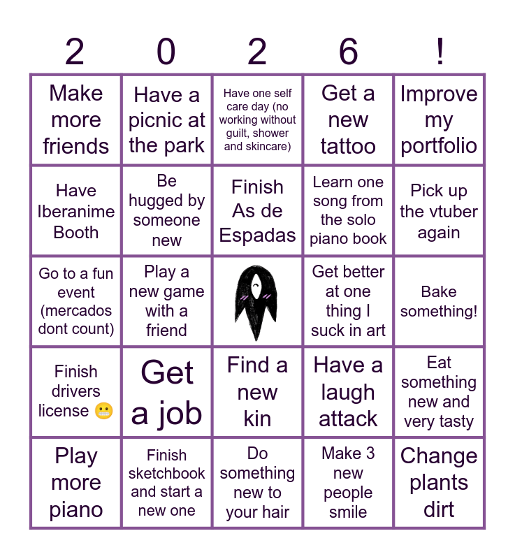 This bingo card has a free space and 24 words: Get a job, Finish sketchbook and start a new one, Finish As de Espadas, Play more piano, Improve my portfolio, Make more friends, Have Iberanime Booth, Have a picnic at the park, Get better at one thing I suck in art, Find a new kin, Learn one song from the solo piano book, Go to a fun event (mercados dont count), Have a laugh attack, Eat something new and very tasty, Be hugged by someone new, Make 3 new people smile, Bake something!, Have one self care day (no working without guilt, shower and skincare), Pick up the vtuber again, Play a new game with a friend, Change plants dirt, Finish drivers license 😬, Get a new tattoo and Do something new to your hair.