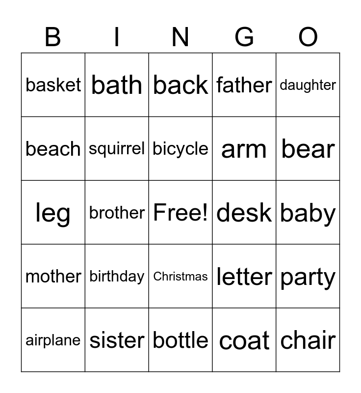 This bingo card has a free space and 25 words: birthday, bottle, bicycle, airplane, daughter, basket, beach, bath, desk, Christmas, arm, leg, letter, party, squirrel, apple, baby, back, bear, brother, chair, sister, mother, father and coat.