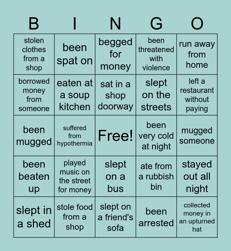 This bingo card has a free space and 27 words: ate from a rubbish bin, more than one week without a shower, slept on the streets, slept on a friend's sofa, borrowed money from someone, begged for money, been spat on, been beaten up, been very cold at night, stayed out all night, been mugged, been threatened with violence, slept in a shed, stole food from a shop, left a restaurant without paying, slept in a church, eaten at a soup kitchen, sat in a shop doorway, played music on the street for money, stolen clothes from a shop, mugged someone, been arrested, suffered from hypothermia, collected money in an upturned hat, slept on a bus, run away from home and been told by the police to move on.