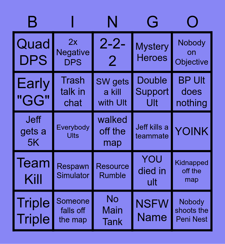 This bingo card has 55 words: Triple Support, Triple Triple, C9, Quad DPS, No Main Tank, Get solo ulted, Trash talk in chat, "Not getting healed", Double Support Ult, Cancelled their ult, Mystery Heroes, 0 deaths, Mag dunks someone, Again, 30 elims, MK/SG after first fight, Nobody on Objective, Everybody Ults, 3 elims, 1 ult, walked off the map, Jeff kills a teammate, 2 ults 1 life, YOU died in ult, 2-2-2, 0 Elim Ult, SW gets a kill with Ult, NSFW Name, Frontline Support, YOINK, Kidnapped off the map, CnD dies during Ult, Thing refuses to anti-dive, AFK Teammate, Nice Teammates, Early "GG", Jeff gets a 5K, Ult after fight is won/lost, Team Kill, Nobody shoots the Peni Nest, Walks and Dies on Peni Nest, 2x Negative DPS, 22K Healing, DPS blames Tank, Lord DPS gets diffed in mirror match, Respawn Simulator, Someone falls off the map, Terrible Mic, Groot walls off own team, Strange wastes portal, BP Ult does nothing, Support out damages DPS, Feeding Freddy, Double 99% Domination, Resource Rumble and Tank explodes.