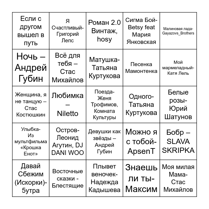 This bingo card has 33 words: Моя милая Мама- Стас Михайлов, Ай-яй-яй – Руки Вверх, Любимка – Niletto, Ай яй яй - Леонид Агутин и Thomas Nevergreen, Улыбка- Из мультфильма «Крошка Енот», Всё для тебя – Стас Михайлов, Малиновая лада- Gayazovs_Brothers, Давай Сбежим (Искорки)- 5утра, Я Счастливый- Григорий Лепс, Царица- ANNA_ASTI, Матушка- Татьяна Куртукова, Роман 2.0 Винтаж, hosy, Один В Поле Воин- Bearwolf, Кукла колдуна – Король и Шут, Одного- Татьяна Куртукова, Мой мармеладный- Катя Лель, Восточные сказки - Блестящие, Женщина, я не танцую – Стас Костюшкин, Остров- Леонид Агутин, DJ DANI WOO, Можно я с тобой- ApsenT, Девушки как звёзды – Андрей Губин, Седьмой лепесток –Антон Токарев, Если с другом вышел в путь, Белые розы- Юрий Шатунов, Плывет веночек- Надежда Кадышева, Поезда- Женя Трофимов, Комната Культуры, Сигма Бой- Betsy feat Мария Янковская, Песенка Мамонтенка, Ночь – Андрей Губин, Бобр – SLAVA SKRIPKA, Худи- Джиган, Artik & Asti и NILETTO, Знаешь ли ты- Максим and Дарите женщинам цветы- Jazzdauren.