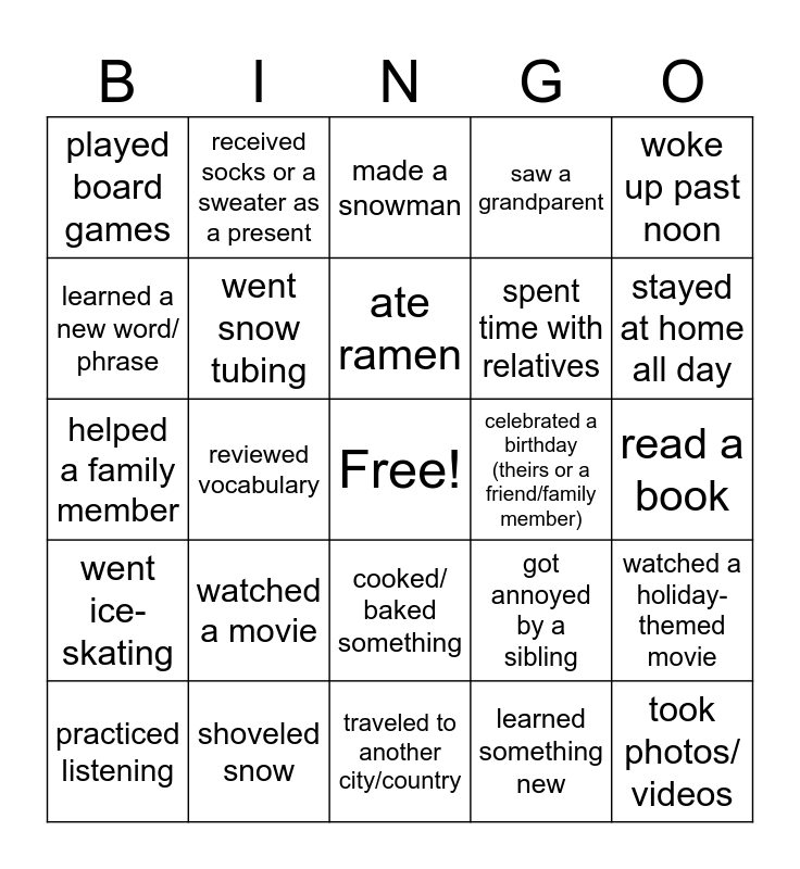 This bingo card has a free space and 24 words: watched a movie, shoveled snow, ate ramen, practiced listening, woke up past noon, played board games, learned a new word/ phrase, received socks or a sweater as a present, celebrated a birthday (theirs or a friend/family member), cooked/ baked something, spent time with relatives, helped a family member, got annoyed by a sibling, watched a holiday-themed movie, went snow tubing, learned something new, read a book, made a snowman, stayed at home all day, reviewed vocabulary, took photos/ videos, went ice-skating, saw a grandparent and traveled to another city/country.