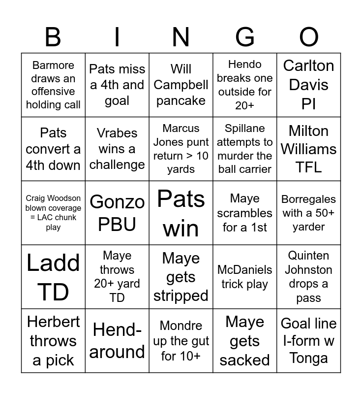 This bingo card has a free space and 24 words: Maye throws 20+ yard TD, Hend-around, Marcus Jones punt return > 10 yards, Herbert throws a pick, Carlton Davis PI, Barmore draws an offensive holding call, Pats convert a 4th down, Pats miss a 4th and goal, Maye scrambles for a 1st, Maye gets stripped, Spillane attempts to murder the ball carrier, Craig Woodson blown coverage = LAC chunk play, McDaniels trick play, Quinten Johnston drops a pass, Vrabes wins a challenge, Maye gets sacked, Borregales with a 50+ yarder, Will Campbell pancake, Milton Williams TFL, Gonzo PBU, Goal line I-form w Tonga, Ladd TD, Hendo breaks one outside for 20+ and Mondre up the gut for 10+.