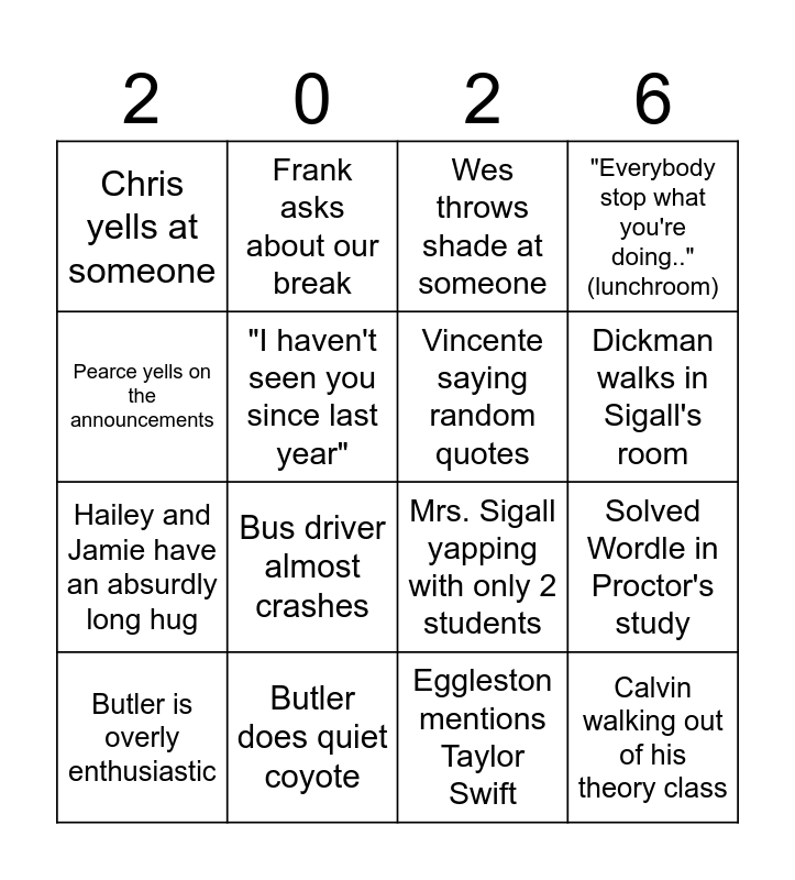 This bingo card has 16 words: Butler does quiet coyote, Solved Wordle in Proctor's study, Wes throws shade at someone, Chris yells at someone, Hailey and Jamie have an absurdly long hug, Frank asks about our break, Mrs. Sigall yapping with only 2 students, Eggleston mentions Taylor Swift, Pearce yells on the announcements, "I haven't seen you since last year", Butler is overly enthusiastic, "Everybody stop what you're doing.." (lunchroom), Bus driver almost crashes, Dickman walks in Sigall's room, Vincente saying random quotes and Calvin walking out of his theory class.