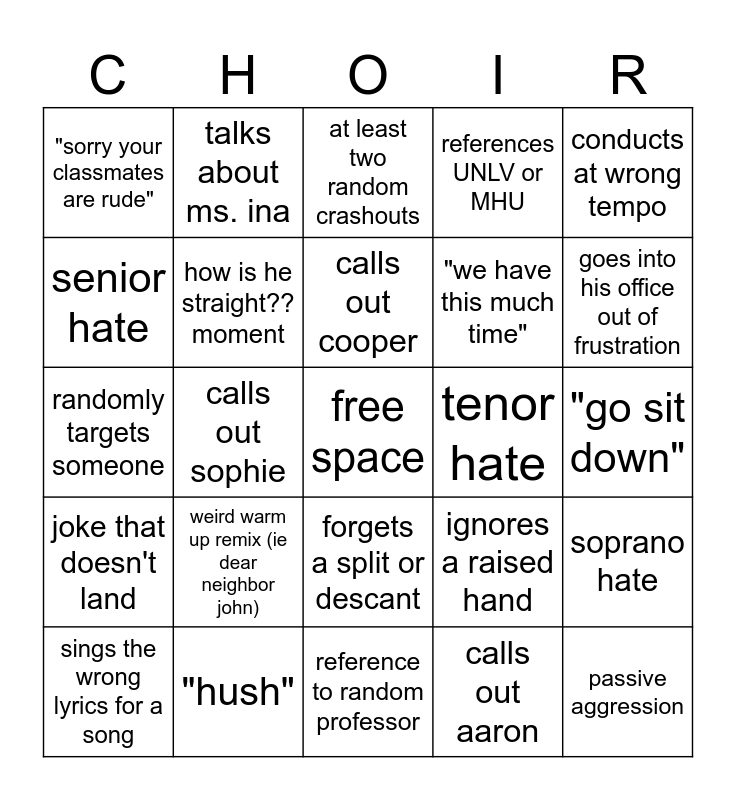 This bingo card has a free space and 44 words: weird laugh, passive aggression, "shut up", sings the wrong lyrics for a song, calls out shaemus, calls out aaron, at least two random crashouts, calls out garrison, conducts at wrong tempo, "hush", references UNLV or MHU, tenor hate, forgets a split or descant, weird warm up remix (ie dear neighbor john), random story that goes nowhere, reference to random professor, bad piano skills, randomly targets someone, point and boo, goes into his office out of frustration, talks about ms. ina, calls out an entire section, "concert (or mixed) does better", "sorry your classmates are rude", calls out patience, "go sit down", demonstrates singing opera style, threatens failure or reauditioning, ignores a raised hand, joke that doesn't land, calls out connley, soprano hate, alto hate, bass hate, calls out sophie, takes at minimum 15 minutes to start class, door-related crashout, whistle into mic/blown excessively, calls out cooper, senior hate, "we have this much time", confuses chamber and concert, how is he straight?? moment and actually somewhat funny.