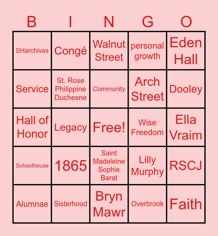 This bingo card has a free space and 24 words: 1865, Sisterhood, Community, Alumnae, Eden Hall, SHarchives, Service, Congé, Wise Freedom, Saint Madeleine Sophie Barat, Arch Street, Hall of Honor, Lilly Murphy, RSCJ, St. Rose Philippine Duchesne, Overbrook, Ella Vraim, Walnut Street, Dooley, Legacy, Faith, Schoolhouse, personal growth and Bryn Mawr.
