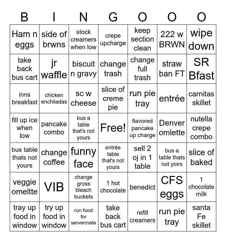 This bingo card has a free space and 48 words: benedict, straw ban FT, take back bus cart, pancake combo, sc w cheese, nutella crepe combo, side of brwns, try up food in window, 222 w BRWN, entrée table that's not yours, wipe down, crepe upcharge, entrée, run pie tray, veggie omeltte, Denver omlette, take back bus cart, SR Bfast, CFS eggs, keep section clean, change full trash, bus a table that's not yours, Ham n eggs, jr waffle, 1 chocolate milk, biscuit n gravy, carnitas skillet, tray up food in window, slice of creme pie, chicken enchiladas, run pie tray, flavored pancake up charge, slice of baked, VIB, fill up ice when low, sell 2 oj in 1 table, bus a table thats not yoirs, inns breakfast, funny face, change gross bleach buckets, bus table thats not yours, santa Fe skillet, stock creamers when low, run food for servermate, change trash, 1 hot chocolate, change coffee and refill creamers.