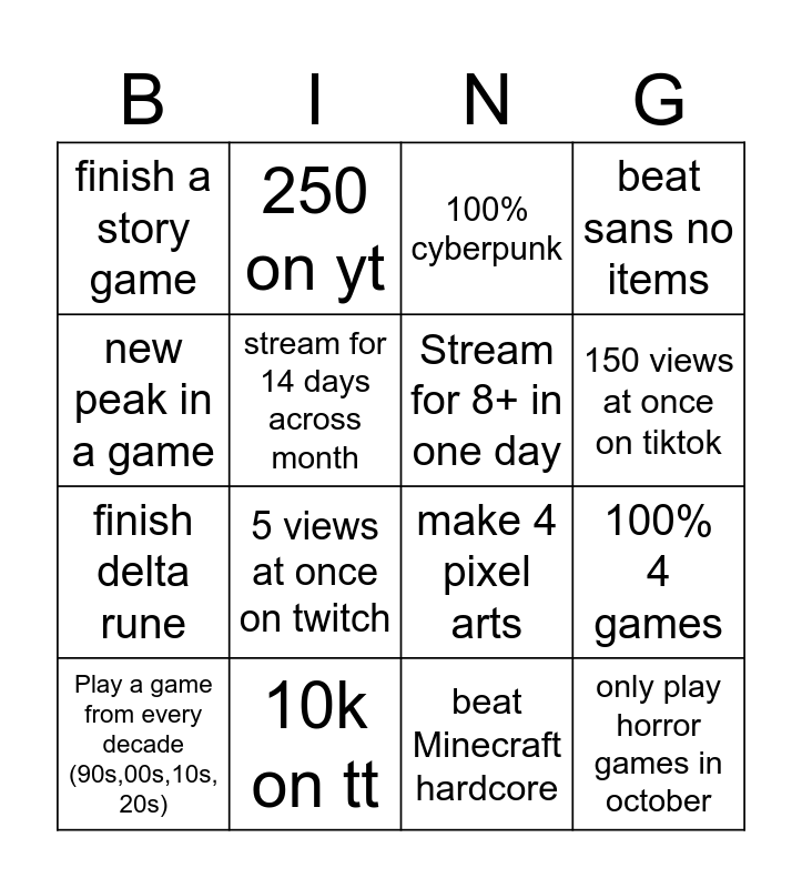 This bingo card has 16 words: 10k on tt, 100% 4 games, 100% cyberpunk, finish a story game, finish delta rune, 250 on yt, make 4 pixel arts, beat Minecraft hardcore, new peak in a game, stream for 14 days across month, Play a game from every decade (90s,00s,10s, 20s), beat sans no items, 5 views at once on twitch, 150 views at once on tiktok, Stream for 8+ in one day and only play horror games in october.