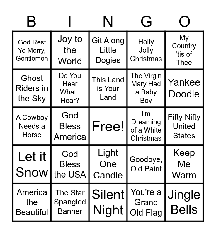 This bingo card has a free space and 24 words: God Bless the USA, The Star Spangled Banner, This Land is Your Land, America the Beautiful, My Country 'tis of Thee, God Rest Ye Merry, Gentlemen, Ghost Riders in the Sky, Joy to the World, I'm Dreaming of a White Christmas, Light One Candle, The Virgin Mary Had a Baby Boy, A Cowboy Needs a Horse, Goodbye, Old Paint, Keep Me Warm, Do You Hear What I Hear?, You're a Grand Old Flag, Fifty Nifty United States, Git Along Little Dogies, Yankee Doodle, God Bless America, Jingle Bells, Let it Snow, Holly Jolly Christmas and Silent Night.