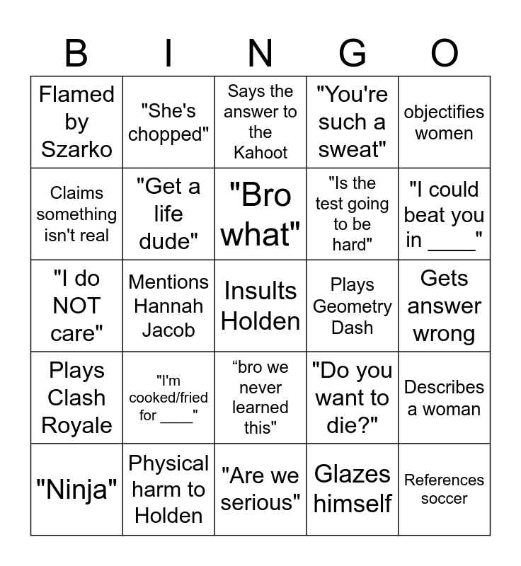 This bingo card has a free space and 27 words: "Do you want to die?", "Don't make me punch you", "Is the test going to be hard", "Are we serious", Claims something isn't real, Says the answer to the Kahoot, "She's chopped", Plays Clash Royale, Plays Geometry Dash, Describes a woman, "I do NOT care", "You're such a sweat", "Ninja", Physical harm to Holden, "I could beat you in ____", Insults Rylie's basketball skills, "Get a life dude", "Bro what", "I'm cooked/fried for ____", Flamed by Szarko, Gets answer wrong, Glazes himself, Mentions Hannah Jacob, References soccer, “bro we never learned this", objectifies women and Successful Ragebait.