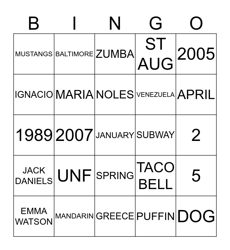 This bingo card has 50 words: JUNE, JANUARY, SEPTEMBER, GREECE, UNF, MCDREAMY, BALTIMORE, DENVER, IGNACIO, NICOLA, MARIA, ST AUG, 5, TACO BELL, ARLINGTON, CANES, NOLES, SUBWAY, 2018, 2005, 2007, PUFFIN, MUSTANGS, VENEZUELA, PHILIPPINES, DOG, APRIL, 30, ZUMBA, SPRING, GEMINI, AQUARIUS, DANIEL, 27, MANDARIN, DOUGLAS ANDERSON, LACROSSE, DANCE, JAGS, 2, SPICE GIRLS, PASSAT, RIVERSIDE, VIRGINIA, EMMA WATSON, 1989, 1987, BENAVIDES, JACK DANIELS and MAX.