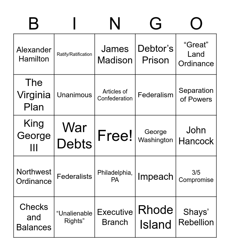 This bingo card has a free space and 40 words: Thomas Jefferson, King George III, Tyrant, Unanimous, “Unalienable Rights”, Philadelphia, PA, Articles of Confederation, The States, “Great” Land Ordinance, Northwest Ordinance, War Debts, Debtor’s Prison, Shays’ Rebellion, John Hancock, George Washington, Federalists, Anti-Federalists, Alexander Hamilton, George Mason, James Madison, 3/5 Compromise, Rhode Island, Federalism, The Virginia Plan, The New Jersey Plan, The “Great” Compromise, The Preamble, “We the People”, Article I, Article II, Article III, Checks and Balances, Veto, Impeach, Separation of Powers, Executive Branch, Legislative Branch, Judicial Branch, Ratify/Ratification and Two-Thirds.