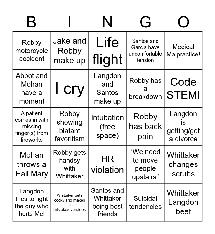 This bingo card has a free space and 24 words: Robby gets handsy with Whittaker, Whittaker gets cocky and makes a mistake/oversteps, Langdon and Santos make up, Langdon tries to fight the guy who hurts Mel, Medical Malpractice!, Robby motorcycle accident, Abbot and Mohan have a moment, Jake and Robby make up, Robby has back pain, HR violation, Robby has a breakdown, A patient comes in with missing finger(s) from fireworks, “We need to move people upstairs”, Whittaker changes scrubs, I cry, Suicidal tendencies, Langdon is getting/got a divorce, Life flight, Code STEMI, Robby showing blatant favoritism, Whittaker Langdon beef, Mohan throws a Hail Mary, Santos and Garcia have uncomfortable tension and Santos and Whittaker being best friends.